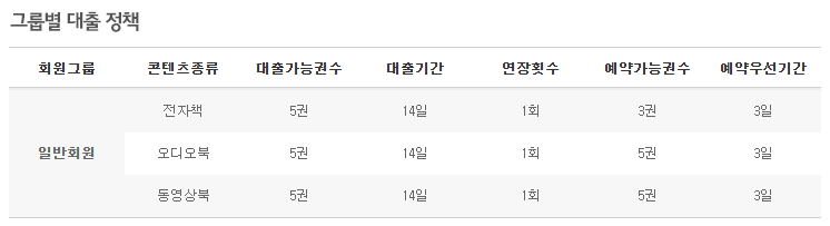 대출 정책으로는 전자책 기준으로 총 5권 대출이 가능하고 대출기간은 14일이라고 해요.