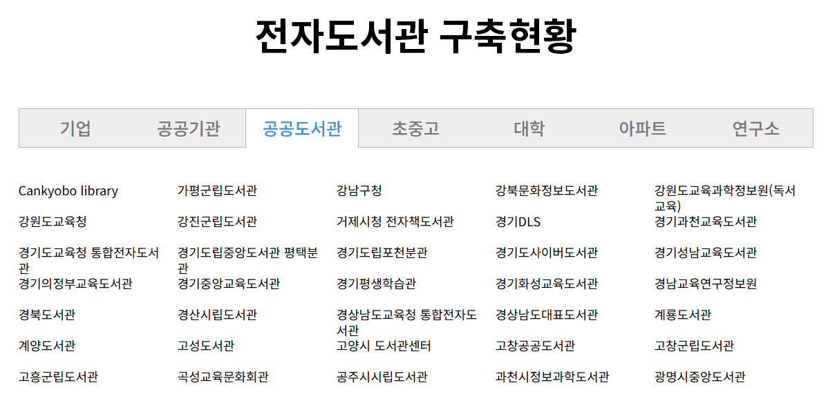 교보문고 전자도서관 홈페이지에 들어가면 구축현황이 나옵니다.